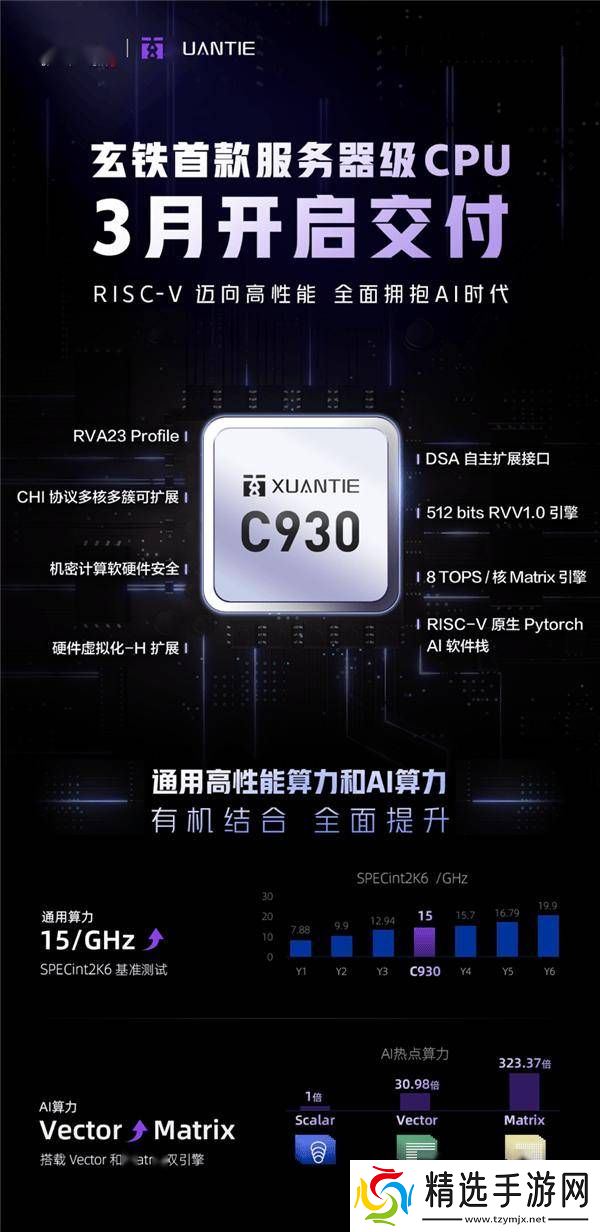 C930处理器的通用算力性能尤为亮眼,在SPECint2006基准测试中,其性能达到了每吉赫兹15分的高水平,专为服务器级高性能应用场景设计。更为先进的是,C930融合了512位RVV1.0向量引擎和8 TOPS Matrix AI加速引擎,实现了通用高性能算力与AI算力的原生结合,并通过开放的DSA扩展接口,为更多特性需求提供了支持。