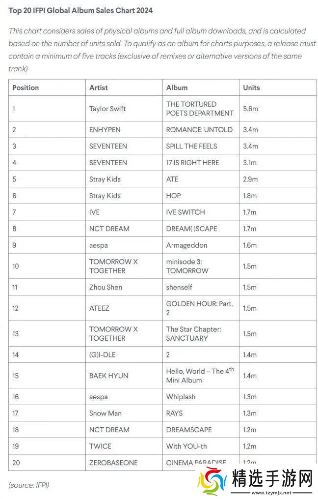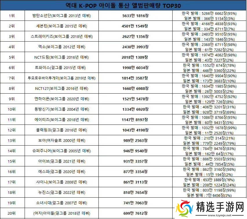 以截止到去年12月底的历代K-Pop艺人累计专辑销量TOP 20数据来看,便有BTS 、SEVENTEEN、Stray Kids等11组(含7人及以上)大型团位列其中,而精确到前五名则均为大型团。根据IFPI公布的去年全球畅销专辑实销榜显示,排名前20的畅销专辑便有10组来自于ENHYPEN、SEVENTEEN等K-Pop大型团。值得一提的是,J-Pop唯一上榜的Snow Man也同样为男子大型团配置。