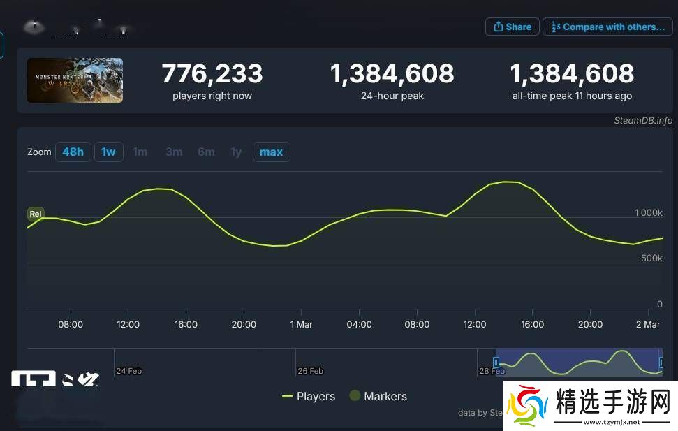 3 月 2 日消息,根据 SteamDB 数据,《怪物猎人:荒野》游戏在 2 月 28 日上线首日,Steam 平台同时在线玩家数峰值达到 1307976 人。