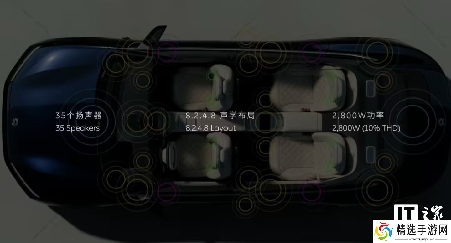该车内置 35 个扬声器,最高功率 2800W,首发“九霄天琴”8.2.4.8 音响系统(8 环绕声、2 低音炮、4 个天空声道、8 个头枕扬声器数量,即每个座椅两个)。蔚来 ET9 的音箱均采用了“连钱纹”图案,寓意“吉祥如意、福泽绵延”。