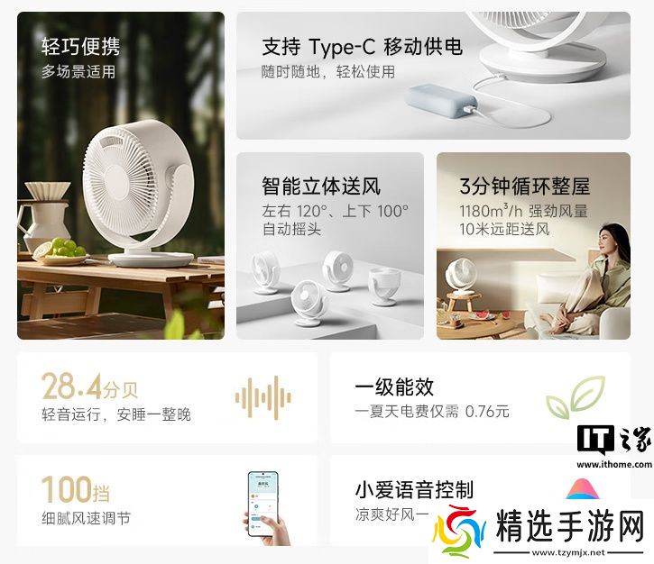 商品页面显示,这款新品体积小巧、不占空间,后置便携提手。产品采用 Type-C 通用接口,多种供电方式,可用标配 18W 适配器为风扇供电,还可用充电宝供电。