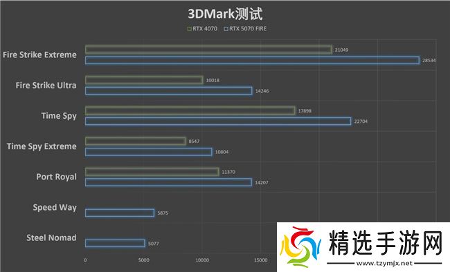 进行3DMark测试,整体测试如上所示,(测试项目包括Fire Strike、Fire Strike Extreme、Fire Strike Ultra、Time Spy、Time Spy Extreme、Port Royal、Speed Way、Steel Nomad共八个项目)在FSE、FSU、TS、TSE、光追测试中,RTX 5070相比RTX 4070,依次有着35.5%,42.2%,26.8%,26.4%,24.9%的提升,整体综合下来,RTX 5070相比RTX 4070,在性能上有着31%左右的性能提升。