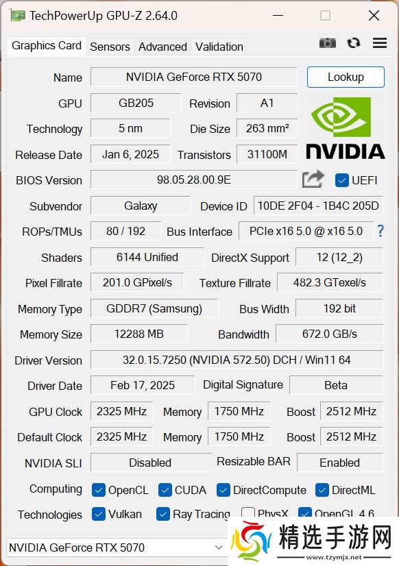 GPUZ内的显示如上所示。影驰RTX 5070 FIRE显卡共有6144个CUDA流处理器,基础频率为2325MHz,加速频率为2512MHz,显存容量为12GB,显存位宽为192-bit,显存速率为28Gbps,TGP为250W。