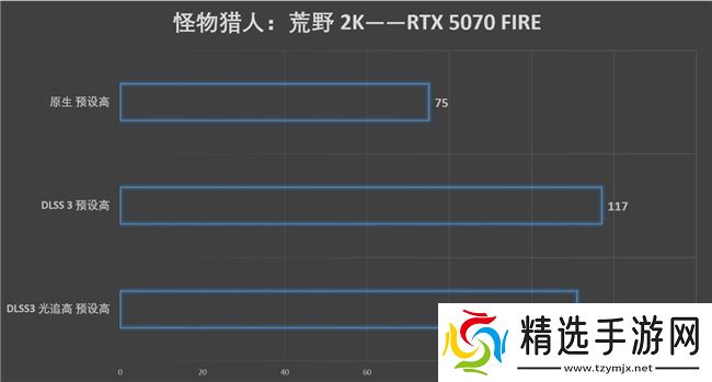 在最新游戏怪物猎人:荒野 Benchmark中,开启高挡位预设,在2K分辨率原生画质下,RTX 5070 FIRE能达到75帧的测试成绩,开启DLSS 3后帧数可以达到117帧,开启光追高挡位的帧数为111帧,整体在2K的表现下还不错。