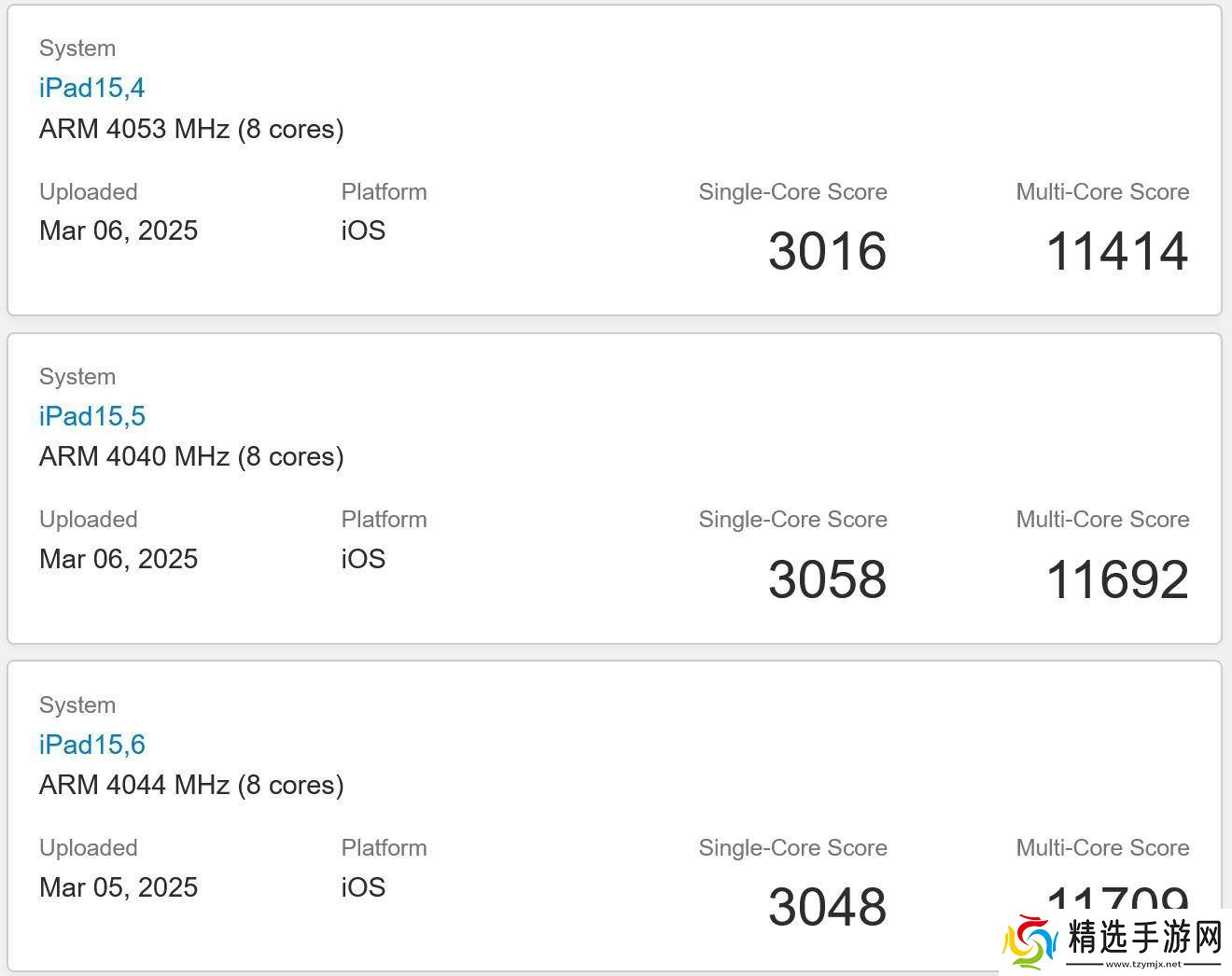 新款 iPad Air 在 Geekbench 6 测试中,共有 3 条记录,多核 CPU 平均得分为 11605,相比搭载 M2 芯片的上一代 iPad Air(平均得分 9817)提升了约 18%。附上相关图片如下:
