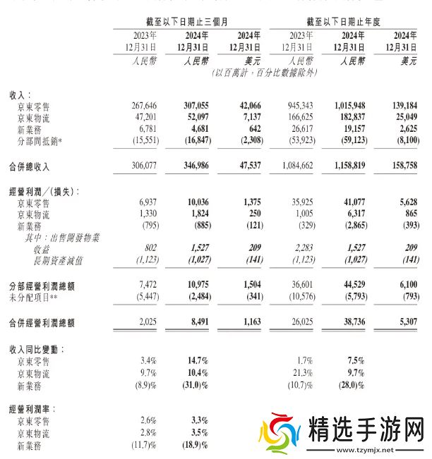 2024年全年,京东收入为11,588亿元人民币,同比增长6.8%;经营利润为387亿元人民币,同比增长48.8%,经营利润率为3.3%;全年归母净利润为414亿元人民币,同比增长71.1%,净利率为3.6%。