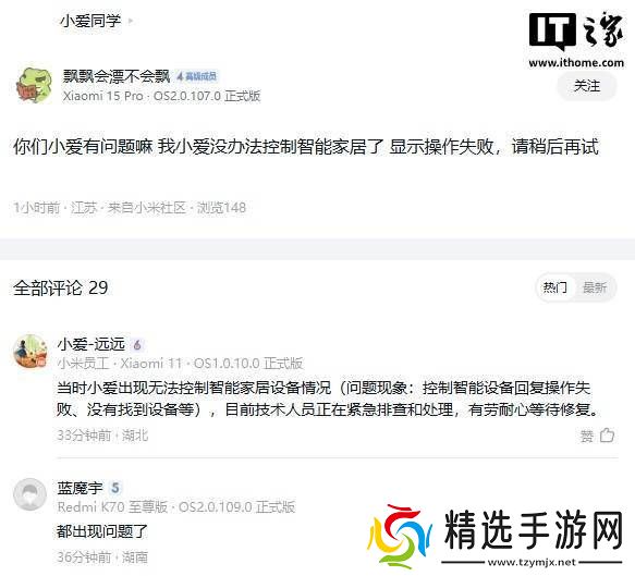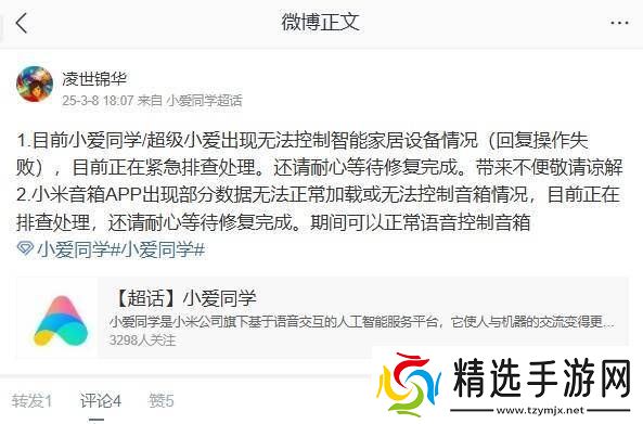 小米社区的知名用户@凌世锦华也对此事发表了看法。他表示,目前小爱同学以及超级小爱确实存在无法控制智能家居设备的情况,用户在尝试操作时系统会回复“操作失败”。同时,他还提到小米音箱App也出现了部分数据无法正常加载或无法控制音箱的问题。不过,他也安抚用户称,这些问题都在紧急排查处理中,并且在此期间,用户仍然可以通过语音正常控制音箱。