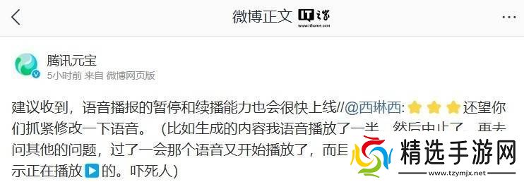 感谢网友提供的线索。近日,腾讯元宝官方通过其官方微博回应网友提问时表示,语音播报的暂停与续播功能将会尽快上线。