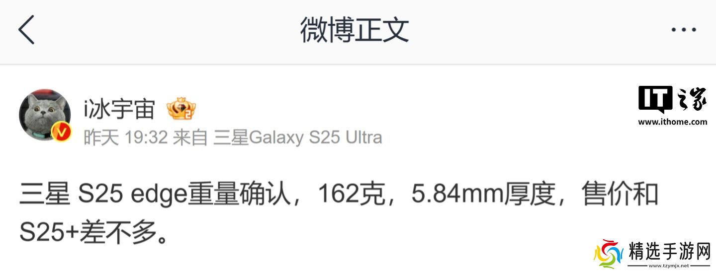 本站 3 月 8 日消息,消息源 @i冰宇宙 昨日(3 月 7 日)发布微博,曝料称三星最薄旗舰手机 Galaxy S25 Edge 机身重量为 162 克,厚度为 5.84 毫米,售价和 S25 + 差不多。