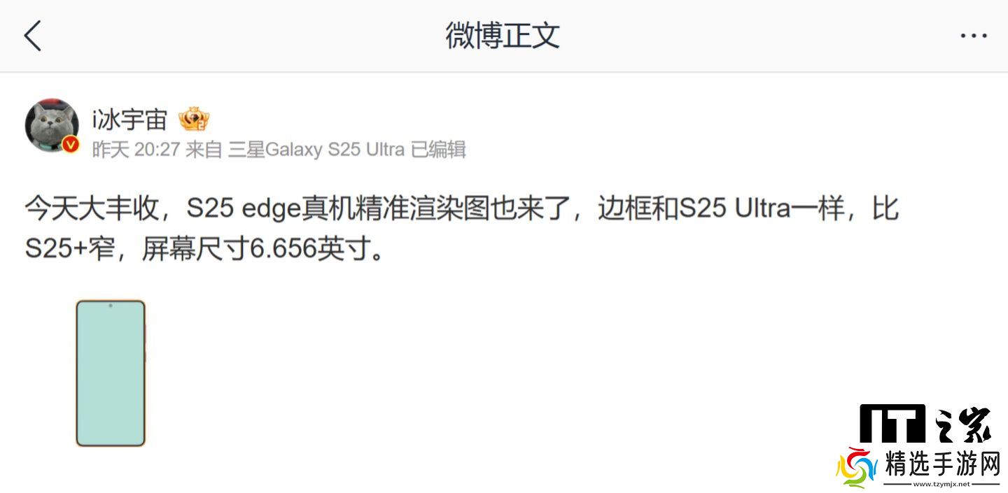 消息源还分享了 Galaxy S25 Edge 真机精准渲染图,称该机边框和 S25 Ultra 一样,比 S25 + 窄,屏幕尺寸 6.656 英寸。