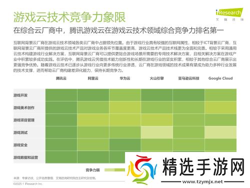 近日,国内权威研究机构艾瑞咨询发布《2025年中国游戏云技术发展洞察报告》(以下简称“报告”),对当前中国游戏云技术的发展现状、竞争力及未来趋势进行了深入剖析。报告指出,在游戏云技术领域,综合云厂商占据主导地位,其中,腾讯云凭借其技术能力和行业积累在游戏云技术领域综合竞争力排名第一。