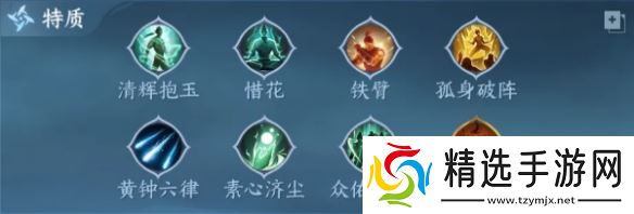 1、特质选择:清辉抱玉+惜花+铁臂+孤身破阵+黄钟六律+素心济尘+众佑弥生+血盾