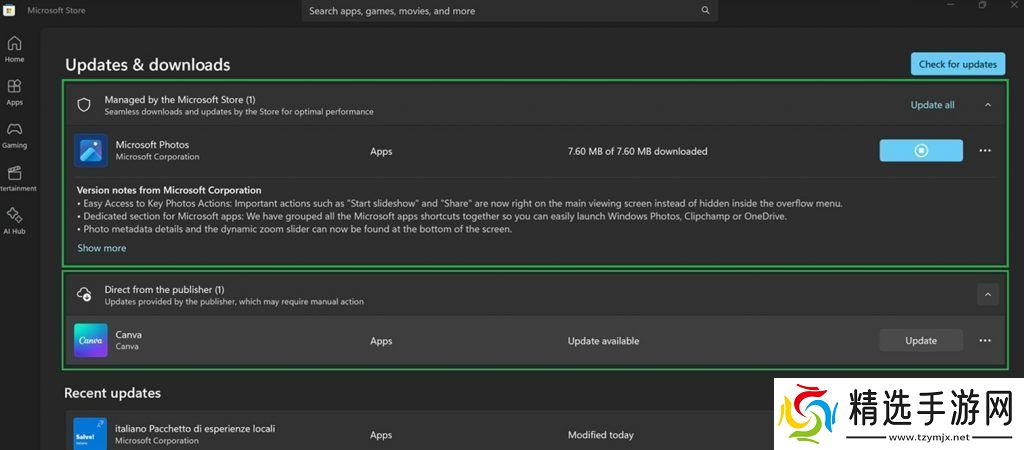 优化下载页面:新增部分用于显示 Microsoft 管理应用的更新(自动应用)和发布者管理应用的更新(可独立更新),便于用户更轻松地管理应用和游戏更新。