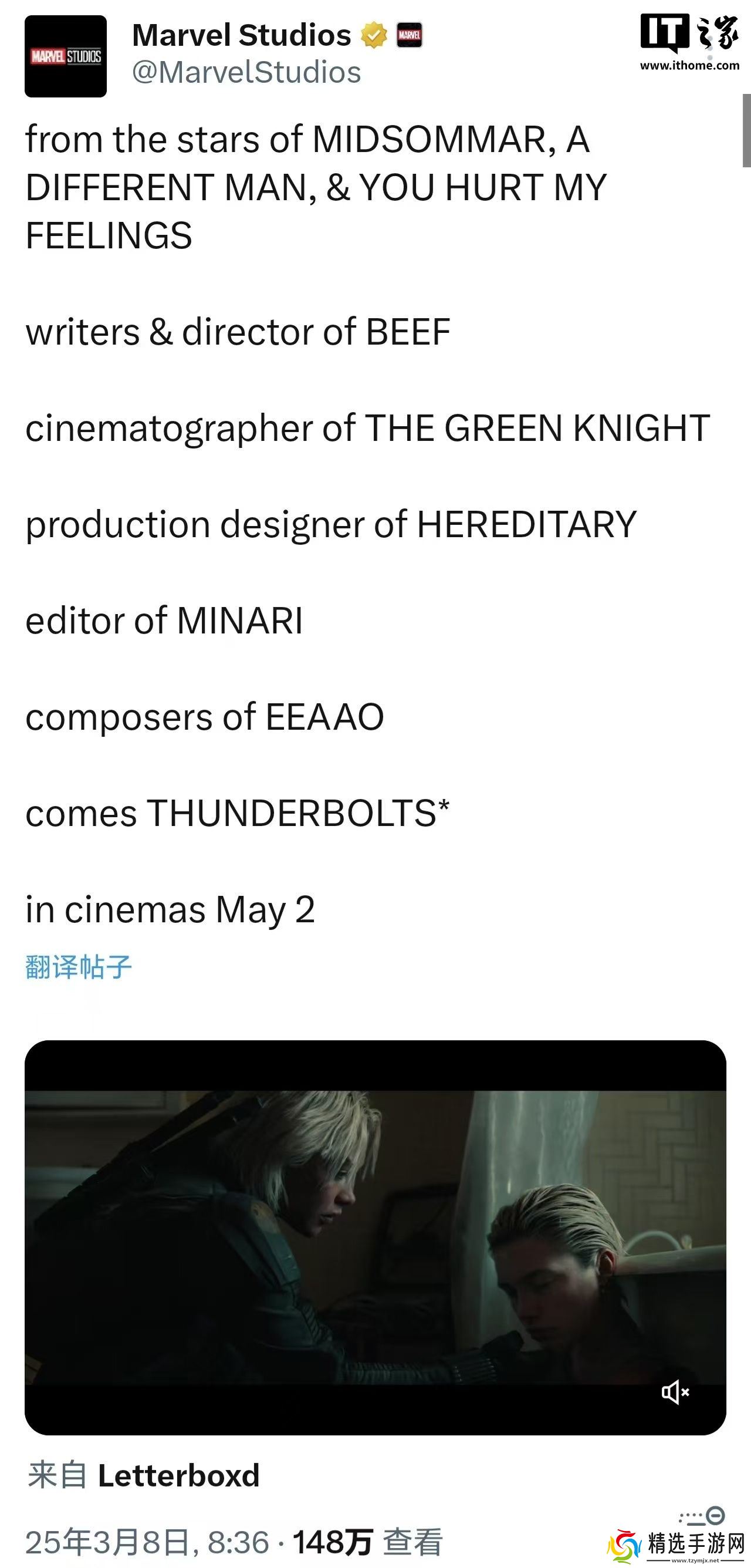 本站注意到,美国漫威影业(Marvel Studios)官方微博昨日也发布了影片的全新中字预告,宣称“奥斯卡级别阵容,演绎反叛套路,打破传统,人生苦短,及时发疯 《雷霆特攻队 *》,漫威‘背景板的逆袭’”。
