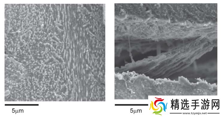 在解剖螳螂虾的掠足时,研究人员发现其表面覆盖着羟基磷灰石(人体中也存在羟基磷灰石,正是这种材料使得我们的牙齿与骨骼坚硬强韧)。羟基磷灰石涂层下方是被称为“冲击区”(impact region)的结构,由人字形排列的甲壳素层构成(甲壳素是一种坚硬的多糖类物质,顾名思义,它能够构成甲壳类生物的外壳)。研究人员认为,这种特定结构的甲壳素能够消散可能引发裂纹的声波。
