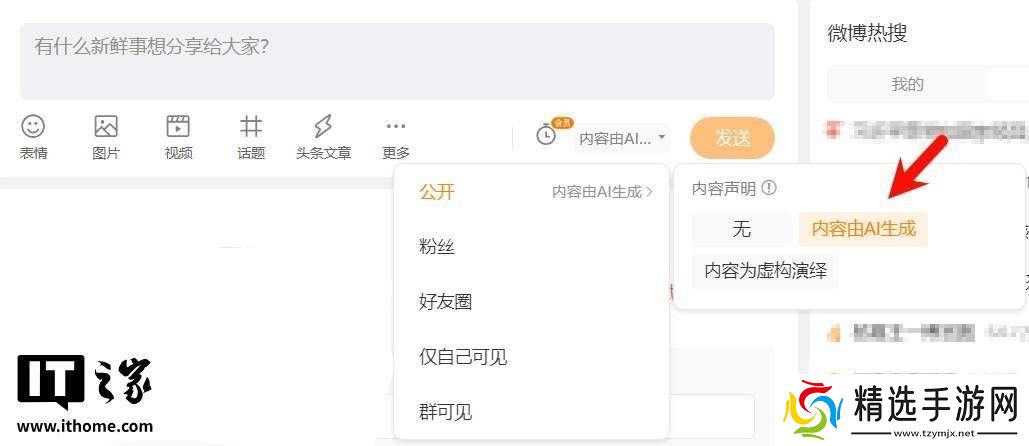 为了引导用户正确标注AI生成内容,微博还提供了详细的操作指南:在发布页面,点击右下角的“公开”选项,选择分享范围后,进入内容声明环节,勾选“内容由AI生成”即可。