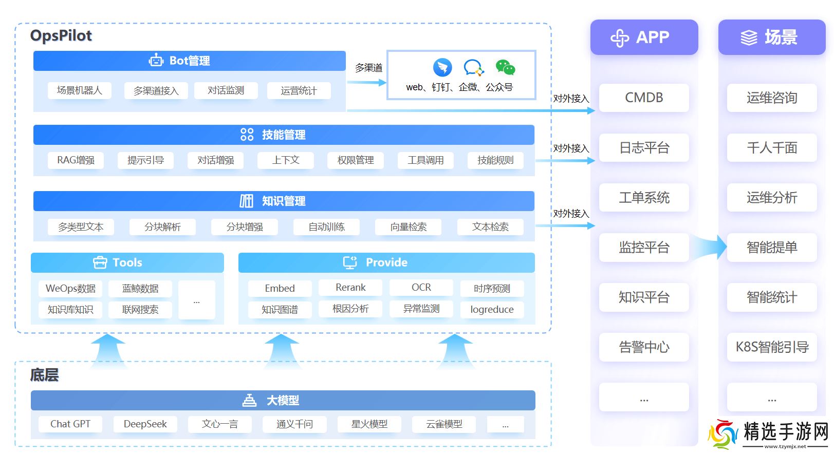 嘉为蓝鲸OpsPilot作为一款综合性的智能运维支撑平台,集成了知识库管理、技能配置、机器人管理及工具管理等多项功能。其核心亮点在于对LLM大模型的深度整合,借助LLM大模型在语义理解、知识增强及多模态处理方面的强大能力,实现了运维问答与操作的智能化。更OpsPilot专注于运维领域,超越了单一LLM大模型的能力范围,成为了一款更加贴合运维需求的智能AI平台。