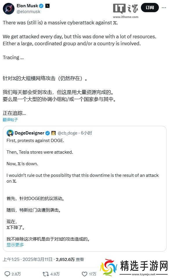 今日凌晨,马斯克回应其社交媒体平台 X 出现故障的问题,称其为一次针对 X 的大规模网络攻击,且目前仍在继续。