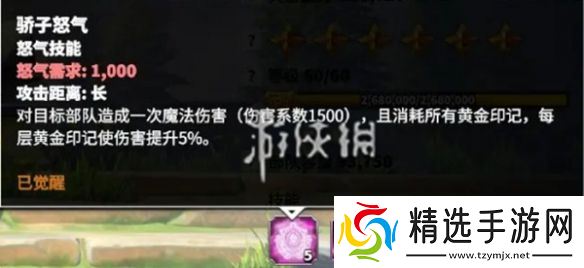 觉醒后:对目标部队造成一次魔法伤害(伤害系数1500),且消耗所有黄金印记,每层黄金印记使伤害提升5%。