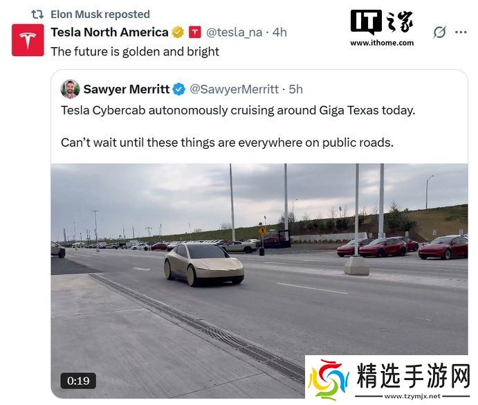 本站 3 月 9 日消息,特斯拉 CEO 埃隆・马斯克今日在社交平台 X 上转发了一条关于特斯拉无人驾驶出租车(Cybercab)的贴文,原文称:“特斯拉 Cybercab 今天在得克萨斯超级工厂附近自动驾驶巡游。真等不及这些车遍布公共道路的那一天了。”视频中是一辆金色涂装的特斯拉 Cybercab。