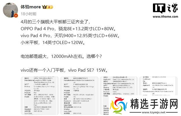 本站 3 月 9 日消息,近日,OPPO、vivo、小米三大品牌的平板产品陆续通过国内的 3C 认证、无线电核准以及电信设备进网许可,博主@体验more 透露新品将于 4 月亮相,采用 12000mAh 左右超大电池。