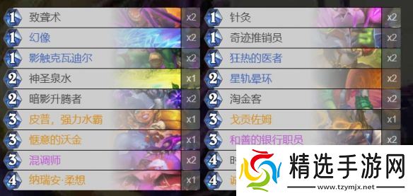 留牌上:起手留奇迹推销员、狂热的医者、星轨晕环、戈贡佐姆。有狂热的医者可以留下毒奶;有1费怪可以留下暗影升腾者;1费2费有怪也可以留下和善的银行职员,找到时空提速4费打出。