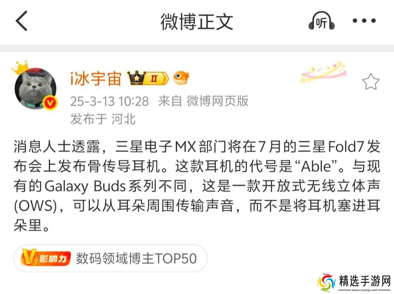 近期,科技圈内传来一则新消息,三星电子MX部门正筹备在7月份发布的三星Galaxy Fold 7系列手机活动上,推出一款创新的骨传导耳机。这一消息由知名爆料人士@i冰宇宙透露,引发了广泛关注。