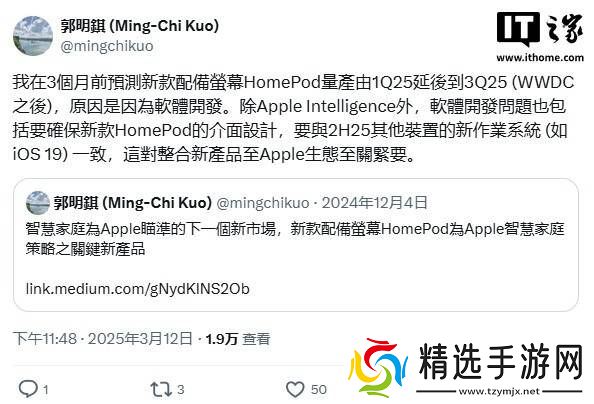 近期,有关苹果即将推出新一代HomePod的消息再度引发关注。据悉,知名苹果分析师郭明錤再次确认了他的预测,指出苹果正计划推出一款配备屏幕的新款HomePod。然而,由于软件开发上的挑战,这款产品的量产时间已从原先的预期推迟至2025年第三季度,确切地说,是在全球开发者大会之后。