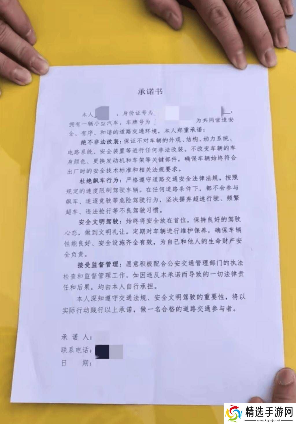 据@测评君描述,交警在电话中态度友好,并未透露出任何紧张的氛围,只是简单提醒开车注意安全。同时,他还晒出了自己所签署的承诺书照片,内容涵盖“绝不非法改装”、“杜绝飙车行为”、“安全文明驾驶”以及“接受监督管理”等多个方面。