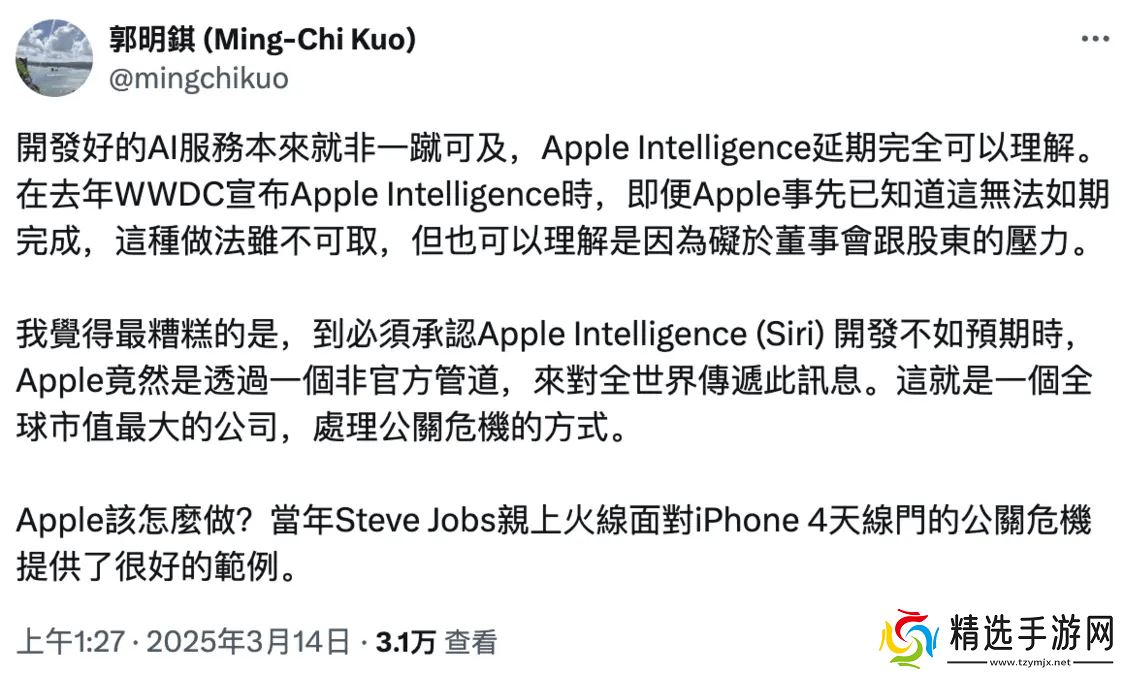 然而,郭明錤对苹果处理此次危机的方式表示强烈不满。他指出,当苹果不得不承认Siri开发进度不如预期时,竟选择通过非官方渠道向全球传达这一信息。作为全球市值最高的企业,苹果在处理此类公关危机时的表现令人失望。