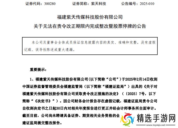 更为紧迫的是,紫天科技在3月13日发布公告称,公司尚未聘请具备证券、期货相关业务资格的会计师事务所,也未向福建证监局提交整改报告。这意味着公司存在无法在规定期限内完成整改的实质性风险。根据相关规定,若公司在停牌后两个月内仍未完成整改,其股票可能被实施退市风险警示并复牌;若在被实施退市风险警示后两个月内仍未完成整改,则可能面临终止上市的风险。