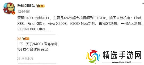 本站 3 月 14 日消息,联发科天玑开发者大会 2025 将于 4 月 11 日在深圳举行。博主@数码闲聊站 爆料称,X925 超大核提频到 3.7GHz,接下来新机有: